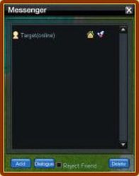 Mensajero [N] Aquí puedes chatear con otros jugadores, además puedes añadirlos o borrarlos de tu lista de amigos. También puedes ver si están en línea o no. A parte de ello, puedes ir al Mini-mundo de un amigo haciendo clic en la casa detrás de su nombre mientras su Mini-mundo esté abierto. Mientras tengas suficientes alas en tu inventario y haciendo clic en las Alas de la Amistad detrás del nombre de un amigo, puedes teletransportarte hacia él. Una ventana de chat minimizada puede ser abierta de nuevo sobre la barra de eventos.